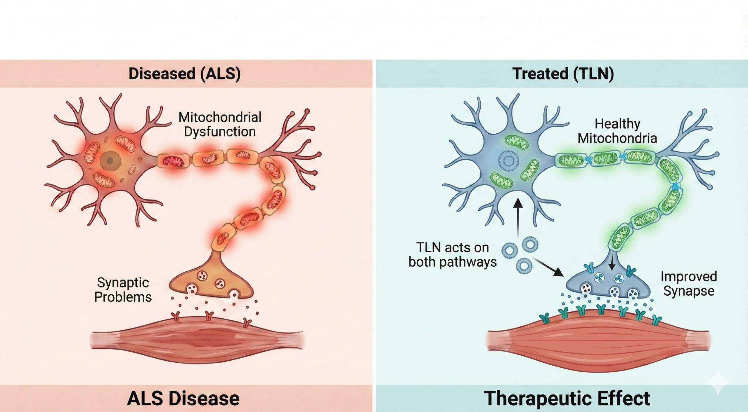 ALS (amyotrophic lateral sclerosis) is a rapidly progressive neurodegenerative disease that leads to the destruction of motor neurons. As the disease advances, affected individuals increasingly lose their ability to move and, in far too many cases, ultimately succumb to respiratory failure. Despite decades of intensive research, no therapy to date has been able to halt or reverse the course of ALS. In collaboration with Smita Saxena, InnoMedica now presents initial preclinical data on the treatment of ALS with Talineuren (TLN) in this publication. The observed beneficial effects of liposomal GM1 on mitochondrial function, synaptic integrity, inflammatory processes, and toxic protein aggregation highlight TLN’s potential as a promising candidate for future clinical investigation in ALS.