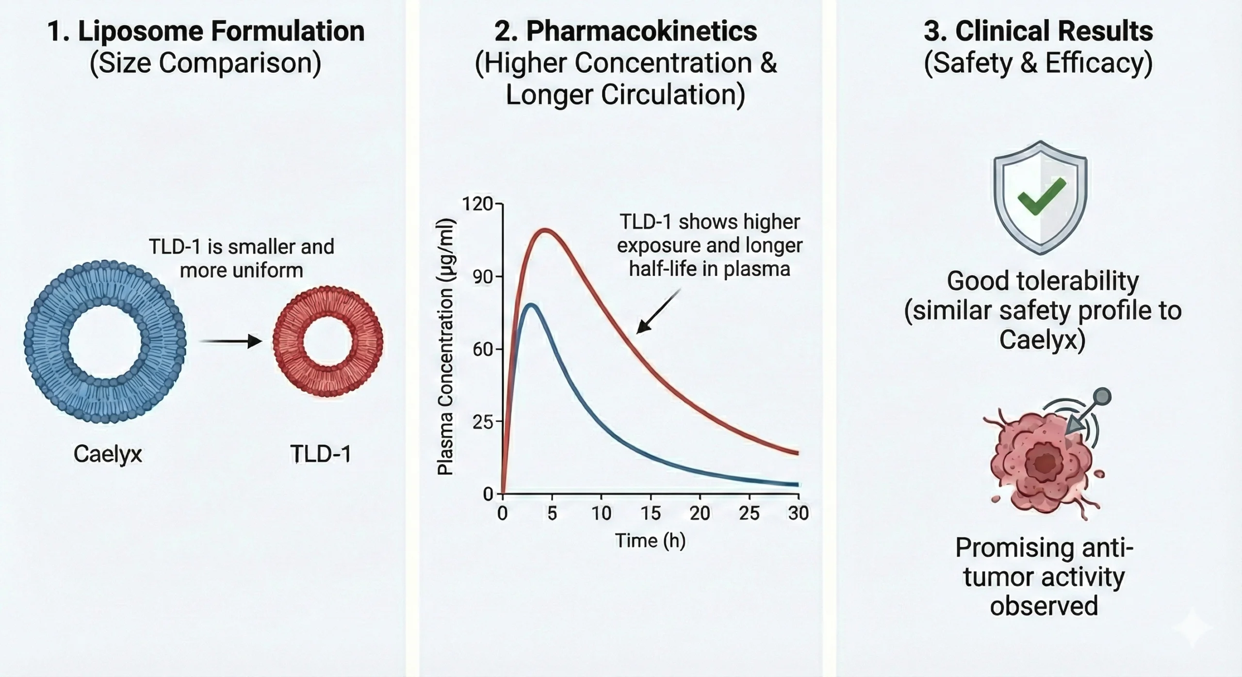 This preclinical work summarises more than a decade of research on Talidox (TLD), a liposomal formulation of doxorubicin with particularly small particle size developed by InnoMedica. The study provides a detailed analysis of how liposome structure, size, and drug loading influence pharmacological behaviour in cellular systems and animal models. Across multiple cancer models, distinct differences were observed compared with established liposomal doxorubicin formulations, both in terms of cellular uptake and tolerability. Taken together, these findings establish a robust scientific foundation for the further clinical development of Talidox and underscore its potential advantages relative to existing doxorubicin-based therapies.